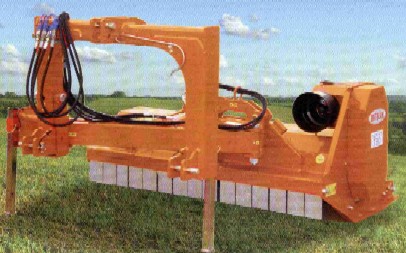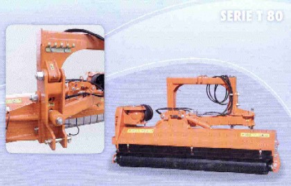 Dieses Modell wird für alle Arbeiten von Reinigung und mulchen von Gras angewandt (Äste Durchmesser von 3 bis 5 cm). Durch den seitlichen hydraulischen Arm kann der T 80 auch für den Schlepper unzugängliche Stellen erreichen oder um Hindernisse gesteuert werden und eine hydraulische Drehvorrichtung ermöglicht das Anwinkeln des Mulchers und damit den Einsatz an Wegrändern oder Böschungen. Eine mechanische Anfahrsicherung vermeidet Beschädigungen beim Auftreffen des Gerätes auf Hindernisse und Unterstütz die Bodenanpassung der Maschine. Die Standardausrüstung enthält einen Antrieb für 540 UpM mit Freilauf, Dreipunktanschluss Kat. II, regelbar hinter Walze und regelbar Kufen in die Höhe. |