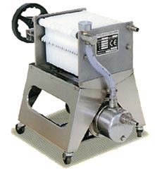 Die Plattenfilter 20x20 der Baureihe Jolly sind aus Edelstahl Aisi 304 gebaut und die Platten sind aus für lebensmittel geeignetem Kunststoff; auf Wunsch aus Moplen Standard oder noryl. Sie wurden geplant, um Weiß- und Rotweine, Schaumweine, Olivenöl, Essig, Kosmetika, natürliche ätherische Öle, Heilpflanzenprodukte, süße und trockene Liköre usw. zu klären und zu sterilisieren. Auf den Standardmodellen ist die Stahlpumpe mit Pumpenrad aus Noryl moniert. Auf wunsch kann die koaxiale Pumpe mit Pumpenrad aus Gummi (NBR) moniert werden. Auf allen modellen kann die Stahlpaletten zur doppelten und variablen Filtrierung sowie die Patrone zur Mikrofiltration montiert werden